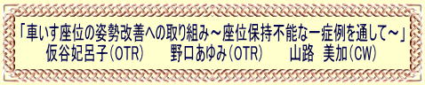 | 【はじめに】 高齢者の車いす座位は,主疾患さらには,廃用症候群や拘縮,変形等といった二次的な要因で困難を来たす場合が多い.適切な座位姿勢は,身体・精神機能に良い影響を与え,また対象者の安楽性,機能性,介護の受けやすさといった点からも重要である.そこで今回,一症例に車いす座位の姿勢を改善するための工夫を行い,若干の知見を得たので報告する. 【対象】 79歳の女性,介護度5自立度C2-M.疾患名は,頭部打撲後遺症による頚椎症(C5/6)と認知症.高度の廃用症候群で,全身的に筋緊張高く,円背である.四肢に関節可動域制限あり,座位保持は不能,ADLは全介助である.言語的コミュニケーションは単語がたまに一つ出る程度,非言語的コミュニケーションは,身体的動作(表情,視線,上肢の動き等)で表現される. 【介入前】 ・リクライニング機能付き車いす ・座面はスリングシート ・頚部にクッション2つ ・体幹前部にクッション1つ 介助者によるポジショニングの日差を認め,頚部過伸展位での食事介助がみられた. 【介入】 ヘッドサポート:ダンボールで作製. バックサポートと座面:ソリッド式(板)に変更. アームサポート:木製で「コの字」型. マニュアルの作成:どの介助者でも常に同じポジショニングができるように配慮. ・リクライニング0度 ・臀部は座面の中央,骨盤は水平に位置させる ・頚部は中間位に位置させる ・両上肢はアームサポートにのせる 【座位機能の検査と方法】 <安楽性の指標>介入前後の座位保持時間を計測. *測定基準 時間:昼食後3時間が経過してからとする. 開始:前述した介入前後のポジションがとれてからとする. 終了:対象者が疲労の意思表示をした時,または開始時より身体軸が10度ずれた時とする.(両肩峰を結んだ線の中央を通る垂直軸を0度とし,左右10度の所に印をしておく) <介護の受けやすさの指標>介護職員へのアンケート調査,OTによる観察. 【結果】 <座位保持時間>介入前の平均値は4.12分,介入後は8.61分であった。各平均値間において,t-検定の結果,有意差を認めた.(p<0.05)(図1) <アンケート結果>17人の介護職員が回答.(表1) <OTによる観察> ・食事介助時:体幹を支持したり,修正する回数が減少した. ・車いす駆動介助:体幹の支持が,ほぼ不要となる. ・上肢運動:顔を掻いたり等の能動的な動作が出やすくなった. 【考察】 今回の介入では,座位保持時間において有意差が見られ,アンケート結果やOTの観察からも介入が効果的であったことが示唆された.また機能性の指標として,嚥下機能を診るVideofluorography検査によると,リクライニング60度で誤嚥を認め0度で嚥下良好だった.栄養という観点からは,介入前はBMIが17.58と低く,ペースト食を特殊食器「らくらくごっくん」で全量摂取することに重点を置いた.これらを総合的に考え,我々はこの座位姿勢が対象者にとって望ましいという結論に至った.個々に適合した車いす座位を提供するには,調整可能なモジュラー型車いすが望ましいのは周知の通りである.しかし,各施設で整備されているところは少ないのが実情である.不適切な車いす座位は,さらに褥創や脊柱変形等といった二次障害を引き起こす可能性があり,セラピストを始め他職種が協働して,積極的に取り組んでいかなければならない課題の一つであると考える. |