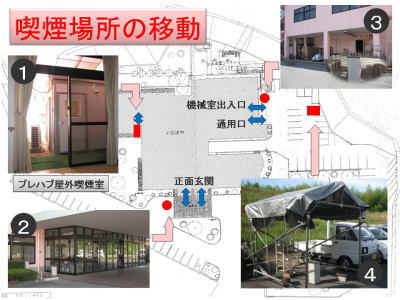 5月:部署会議で職員に「敷地内全面禁煙の必要性」などを説明し、理解を求めた。喫煙場所を出入り口横から20メートル遠方の敷地内の一角へ移動した(図1)。