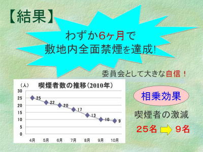喫煙職員は、決して完全禁煙を強要されたわけではなかったが、葛藤し苦悩しながら、禁煙ガムや禁煙パッチの使用、禁煙外来受診等といった個人的努力を重ね、16名の禁煙成功職員が誕生した。