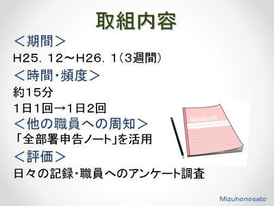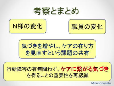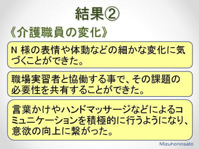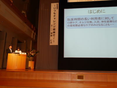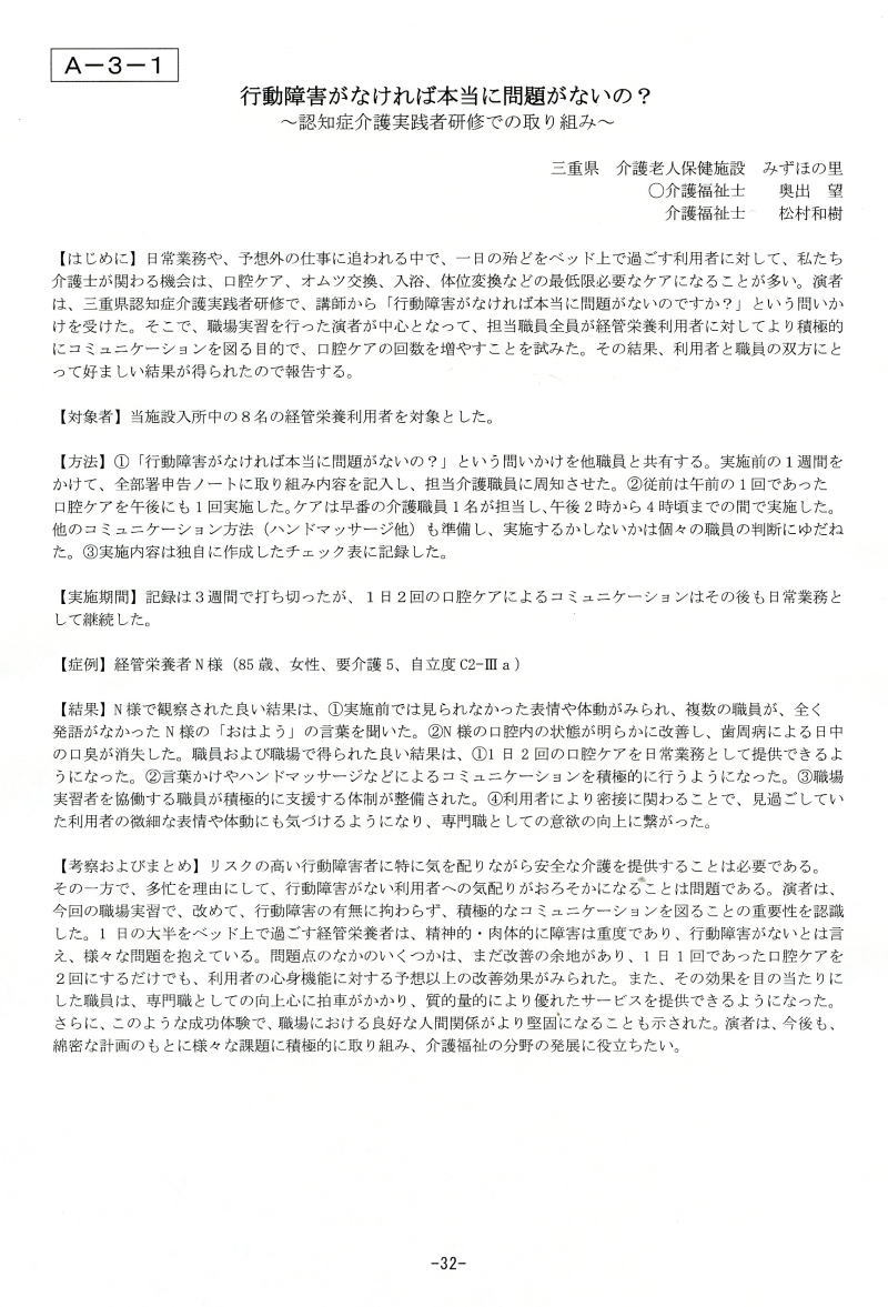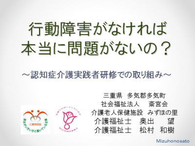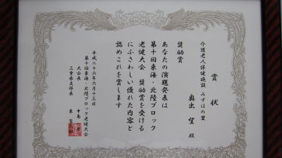 東海・北陸ブロック老健大会での全発表演題数は117題で、三重県の施設からは9題の発表がありました。みずほの里の奥出望介護福祉士(演者)と松村和樹介護福祉士(共同演者)が発表した「行動障害がなければ本当に問題がないの? −認知症介護実践者研修での取り組み−」は高い評価をいただき、中島一彦大会会長(静岡県)、東憲太郎三重県支部長から奨励賞を頂きました。これは、全演題の中の7演題に対してのみ与えられた名誉ある賞です。